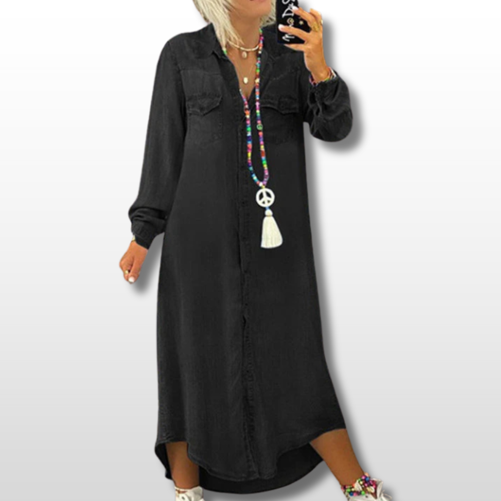 Das langärmelige Maxi-Kleid im Denim-Look vereint zeitlosen Stil mit moderner Eleganz. Der weiche, aber dennoch strapazierfähige Stoff sorgt für ein angenehmes Tragegefühl und verleiht gleichzeitig einen stilvollen und lässigen Look. Mit seinen langen Ärmeln und der Maxi-Länge ist dieses Kleid perfekt für sowohl entspannte als auch festliche Anlässe.
